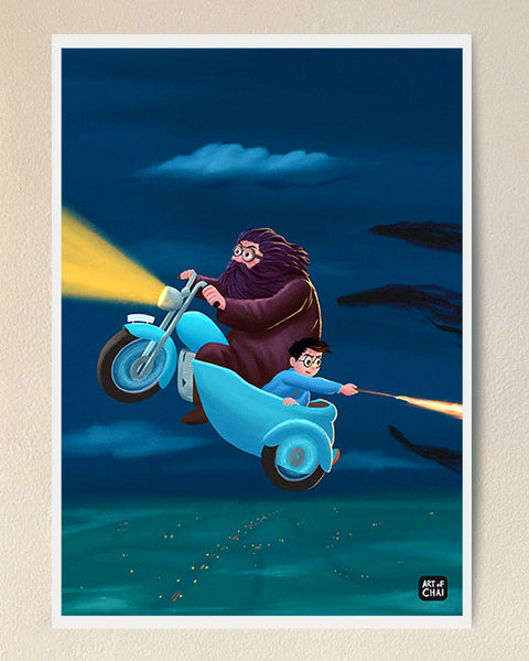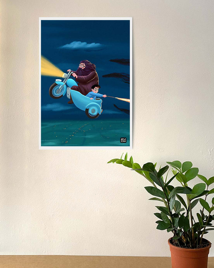 This scene from 'Harry Potter and The Deathly Hallows' was kickass! It was amazing how Hagrid and Harry escape riding the flying motorcycle. Chai drew it like he remembered it from memory, haven't read the books or seen the films in many years now.