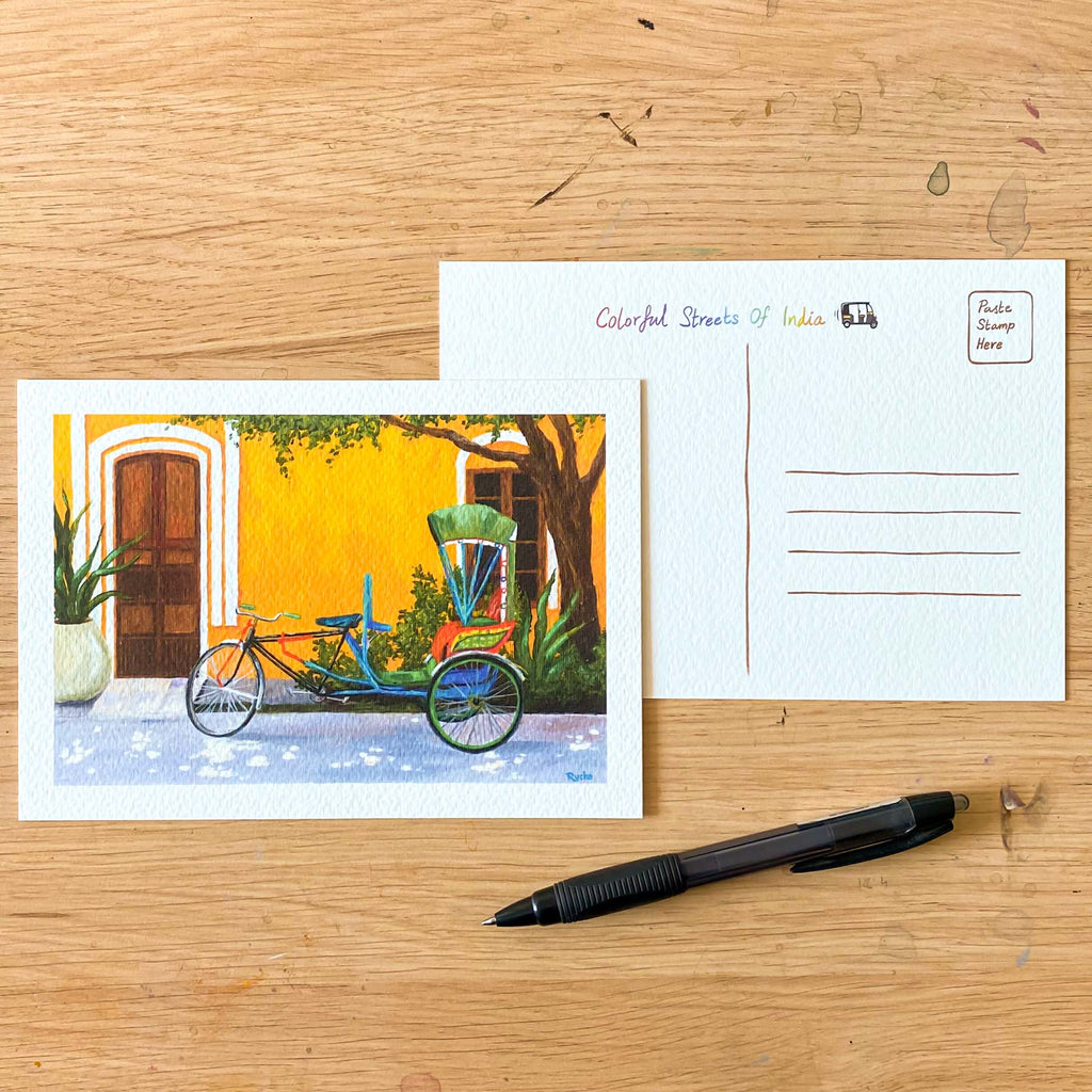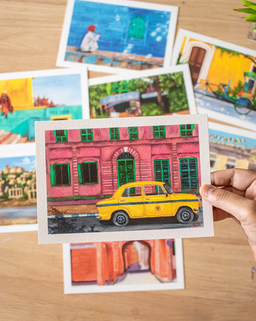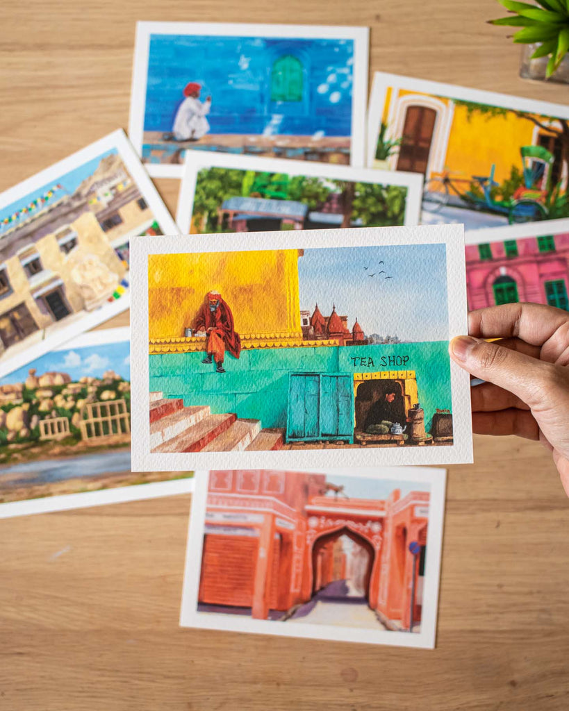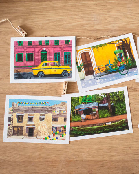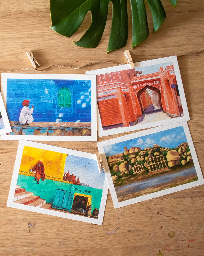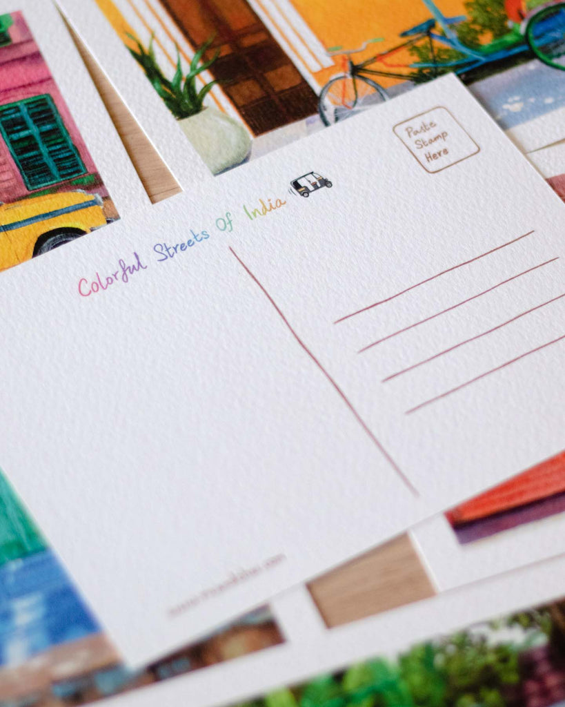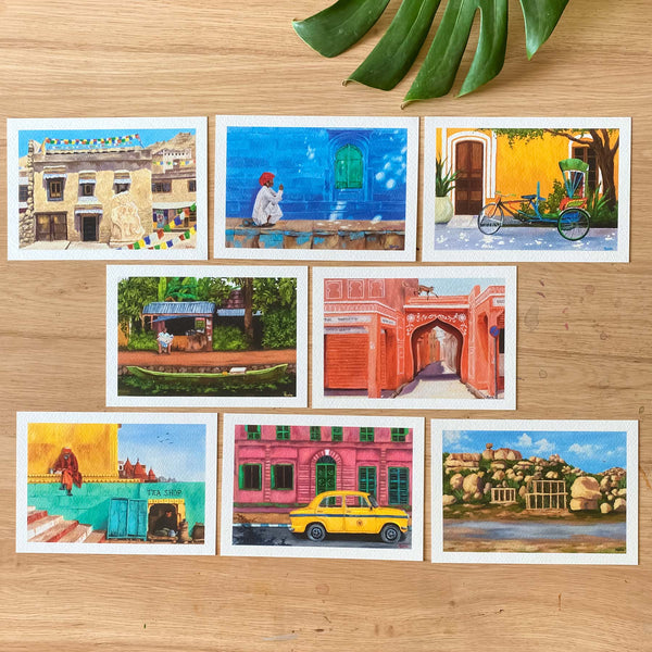 This is a series of postcards made from acrylic paintings by us which are inspired from the vivid & colourful streets of India. We loved making this series right from the research, composition, colors & details to capture the vibe of the place. We are sure this will add to the beauty of your room. :)