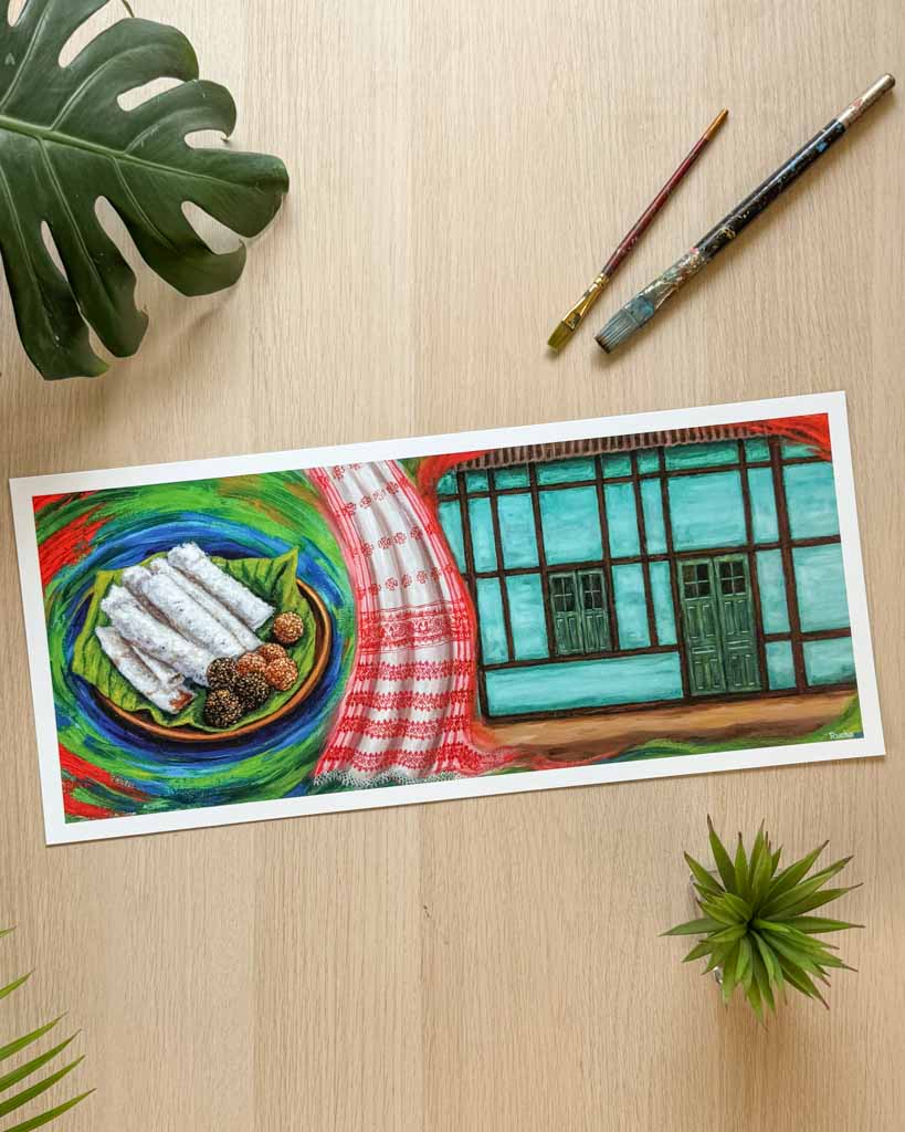 Assam is indeed one of the most gorgeous states. It has beautiful hills, tea farms, forests and what not! The traditional houses are absolutely eco friendly and make use of locally available materials like Bamboos, Ikra, wood, thatch etc. The Assamese cuisine is also as much diverse! I have painted Til Pitha with Til Laroos. Til Pitha has two major ingredients, rice flour and black sesame seeds.This traditional Assamese dish is prepared around special occasions and major festivals like Bihu. The painting will be absolutely incomplete without the traditional Gamosa. 😍